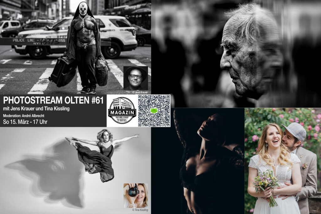 Der Street- und Dokumentarfotograf Jens Krauer und die Porträtfotografin Tina Kissling sind die Gäste des PHOTOSTREAM OLTEN #61. Der Anlass zeigt, wie unterschiedlich fotografische Herangehensweisen sein können: von der unaufdringlichen Beobachtung im öffentlichen Raum bis zur bewusst gestalteten Begegnung vor der Kamera. Zwei Positionen, die exemplarisch für verschiedene fotografische Haltungen stehen und Einblick in ihre jeweilige Praxis geben.